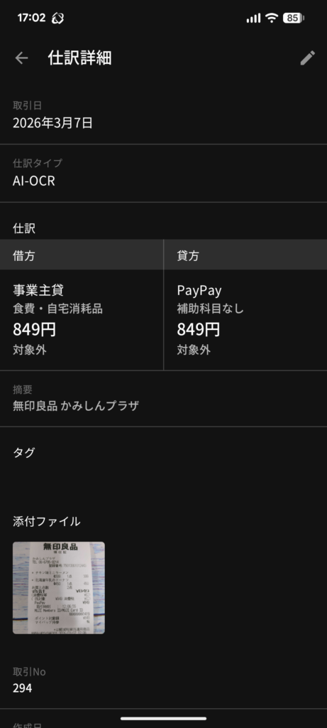画面右上にある「AI-OCRで仕訳」の機能を使いレシートを撮ると、自動で日付、金額、そして内容を適用欄に取り込んでくれます。
