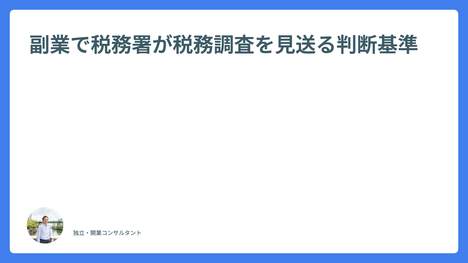 その上で、年間の売上が300万円未満であり、かつ2年、3年と連続で赤字を出し、給与所得との損益通算で還付を受けているようなケースは、税務署の目に留まりやすく、税務調査の対象となる可能性が高いでしょう。